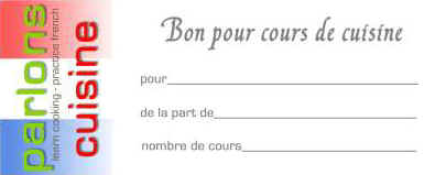 Il suffit de prendre contact avec ParlonsCuisine, vous réglez* le(s) cours et nous vous faisons parvenir un bon cadeau. Les dates pourront être choisies librement dans la mesure des places disponibles*. Vocabulaire * dans la mesure des places disponibles = s'il y a de la place